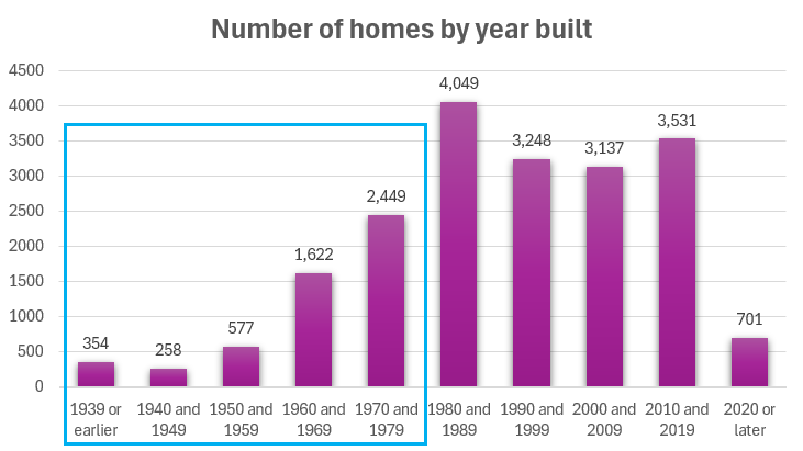 In general, each subsequently older decade prior to 1978 produces a higher likelihood of lead based paint. The graph below gives an approximate number of the homes built by their respective year. The latter half of the graph is relevant to lead based paint risk.