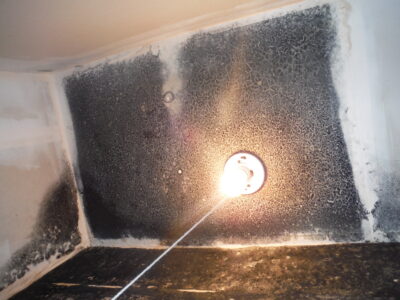 The opposite is true for roof leaks, pipe leaks, etc. Far more mold growth may be present on the backside of the sheet rock than the side facing the room. A visual inspection of the backside of the ceiling is the only way to properly identify the extent of the mold growth.
