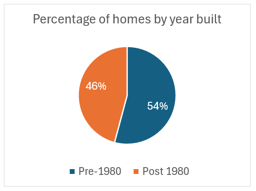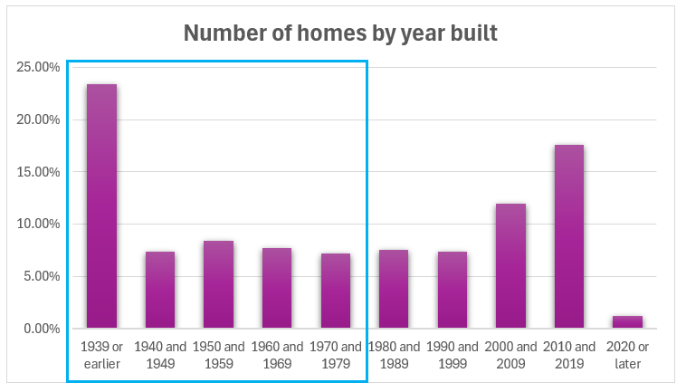 Seattle has relatively old housing stock compared to the Eastside and surrounding areas. This increases the risk of lead based paint, as the age of the home is strongly correlated to the likelihood of lead based paint. The graph below describes the percentage of homes built in each decade. The blue rectangle represents homes with a risk of lead based paint (pre-1978, the year it was banned).
